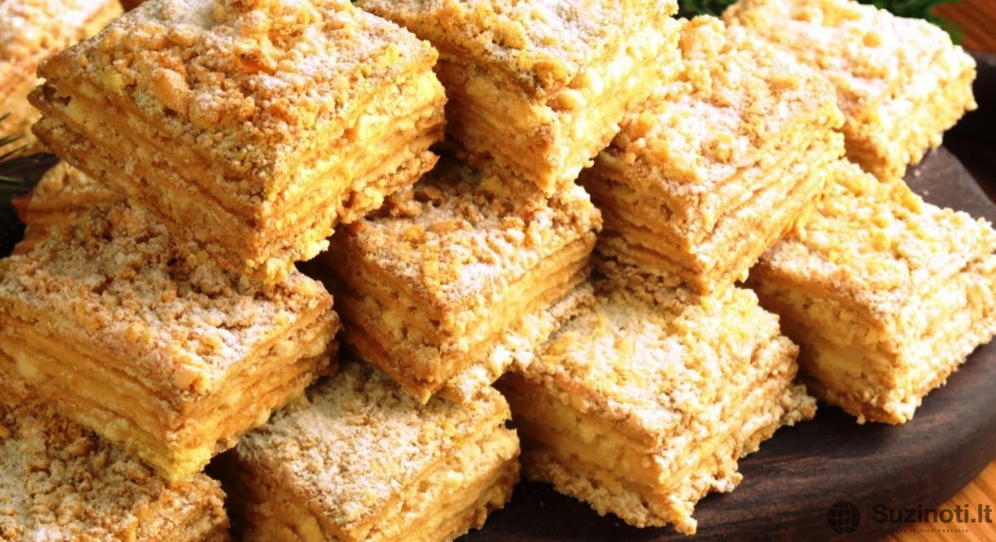 Ant kiekvieno sluoksnio dėkite po šaukštą gauto įdaro. Masę tolygiai paskirstome per sluoksnį, neliesdami raudonai nudažyto krašto.