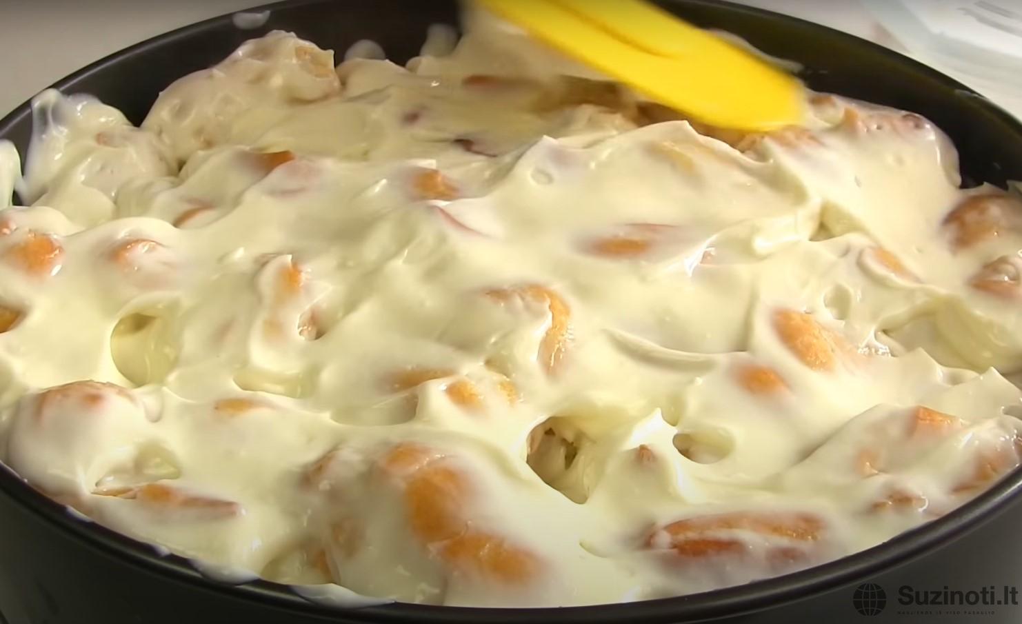 Įdarą susukti į vyniotinį, tokį palikti, susukti į pergamentą ir padėti į šaldytuvą 2-3 valandoms. Kokoso drožles galite sumaišyti su likusia grietinėle ir šiuo mišiniu aplieti vyniotinį.