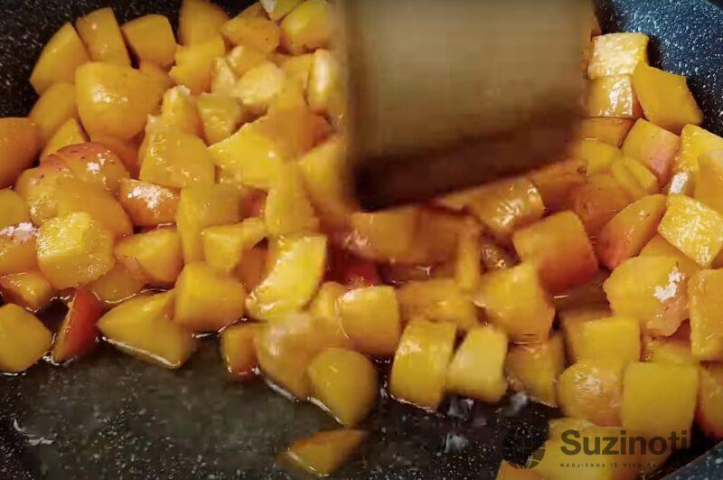 Keptuvėje ištirpiname cukrų ir sumaišome su abrikosais.