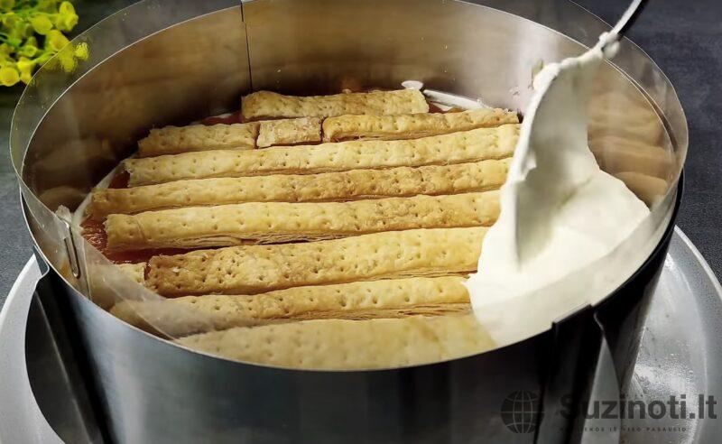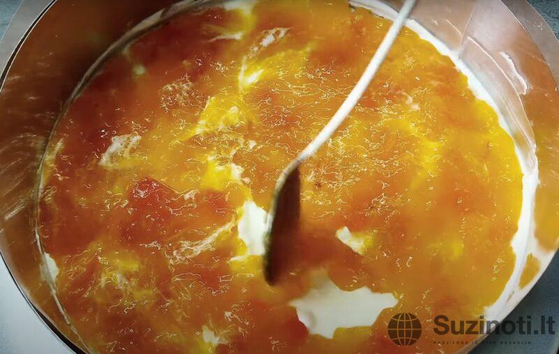 Įdėkite apvalų pyragą į konditerijos žiedą. Sutepkite jį ½ dalimi kremo ir sutrinkite. ½ abrikosų uogienės paskleiskite ant lygaus kreminio paviršiaus.