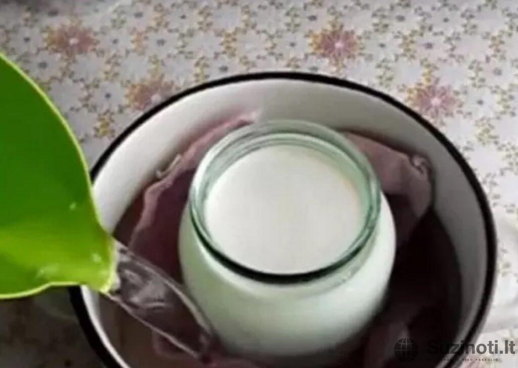 Dabar mes tiesiog pridedame starterį. Tai gali būti įprasta grietinė. Litrui pieno pakanka dviejų ar trijų didelių šaukštų. Išmaišykite, uždarykite dangtį ir palikite visiškai atvėsti.