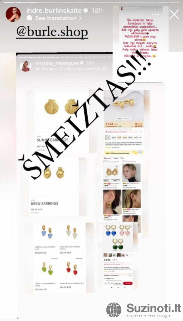 Socialiniuose tinkluose su sekėjais aktyviai bendraujanti ir savo kasdienybe besidalijanti K.Meseguer neseniai ir vėl sulaukė didelio dėmesio. Šįkart – dėl pasidalintų dviejų nuotraukų palyginimo. Vienoje moters paviešintoje nuotraukoje matyti I.Burlinskaitės prekės ženklo papuošalai, o kitoje – panašios prekės iš „Aliexpress“.