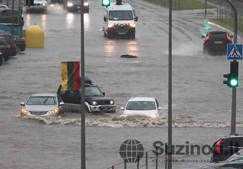 Vaizdo įrašuose matyti, kaip automobiliai bando pravažiuoti pro gausiai užtvindytas gatves, apsemti beveik iki pusės.