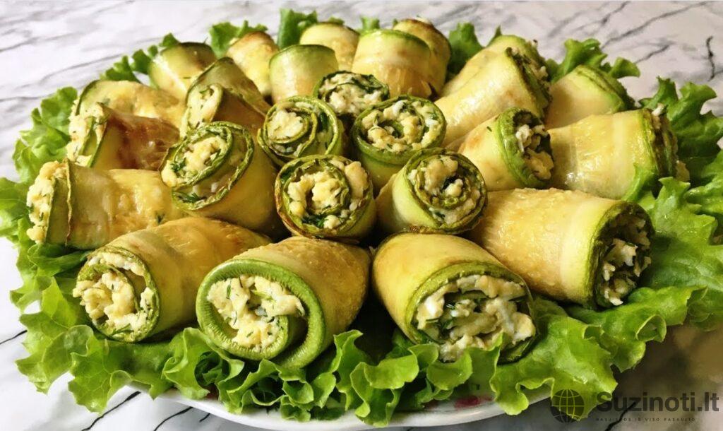 Cukinijų juosteles aptepkite įdaru ir susukite į suktinukus