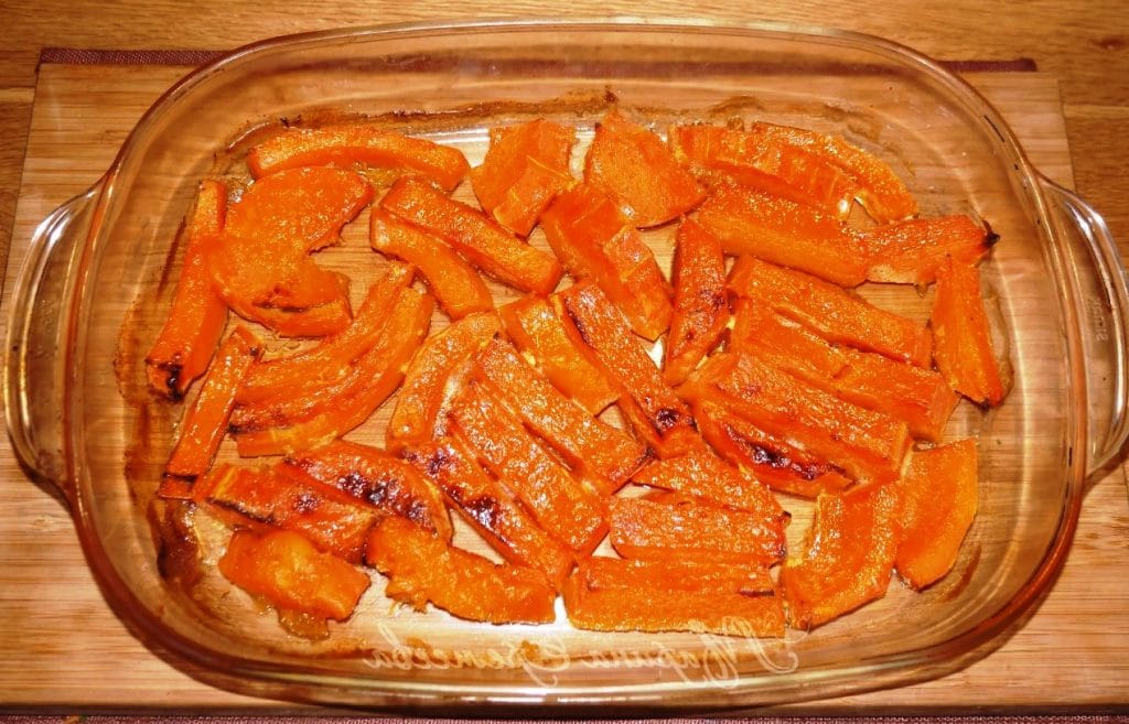 Skardą pašaukite į orkaitę ir kepkite, kol visas skystis išgaruos, o moliūgas suminkštės.