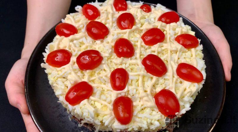 Salotoms papuošti galite pridėti riešutų ir vyšninių pomidorų. Jie puikiai papildys šį nuostabų šventinį patiekalą.