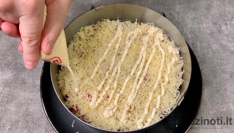 Jautienos pagrindą užtepkite šaukštu majonezo, tada ant viršaus sudėkite grybus ir svogūnus. Ant kiekvieno naujo sluoksnio užtepkite daugiau majonezo.