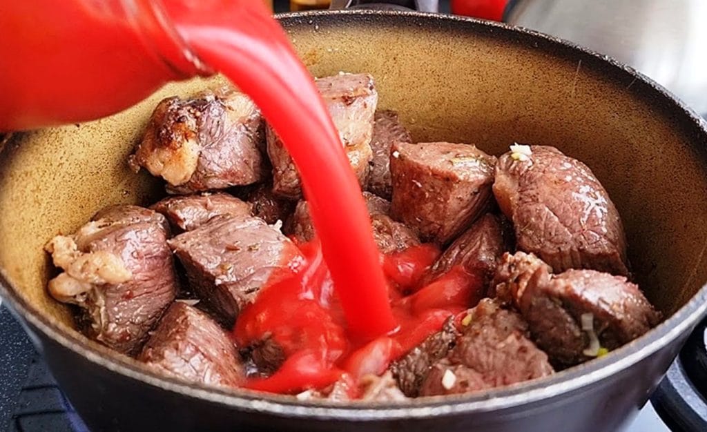Į mėsą įpilkite pomidorų savo sultyse, kvapiųjų pipirų ir lauro lapų, žvaigždanyžių. Mėsą užpilkite vandeniu ir įberkite aitriųjų pipirų.