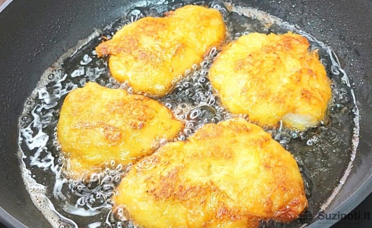 Toliau reikia kepti plonus blynus keptuvėje iki auksinės rudos spalvos.