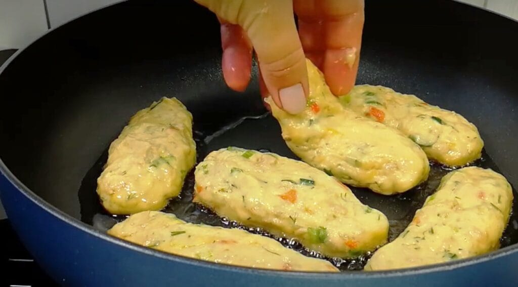 Pyragėlius sudėkite į keptuvę, išteptą augaliniu aliejumi, ir kepkite iš abiejų pusių iki auksinės rudos spalvos.