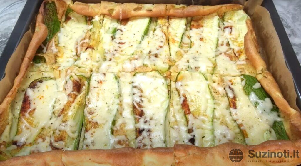 . Ant tešlos sudėkite cukiniją, patiekalą kepkite 180 laipsnių orkaitėje 25-30 minučių. Sutarkuokite sūrį stambia tarka ir apibarstykite juo paruoštą patiekalą, kepkite dar 5-10 minučių.