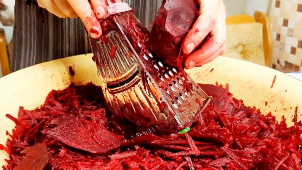 Burokėlius nulupkite ir sutarkuokite stambiomis trintuvės pjaustyklėmis. Burokėlius taip pat galite sutarkuoti plonais griežinėliais.