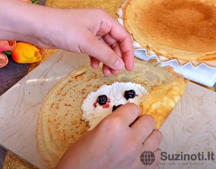 Į varškę taip pat galite įdėti bet kokios uogienės, mūsų atveju – vyšnių uogienės. Apvyniokite ją ta pačia technika.