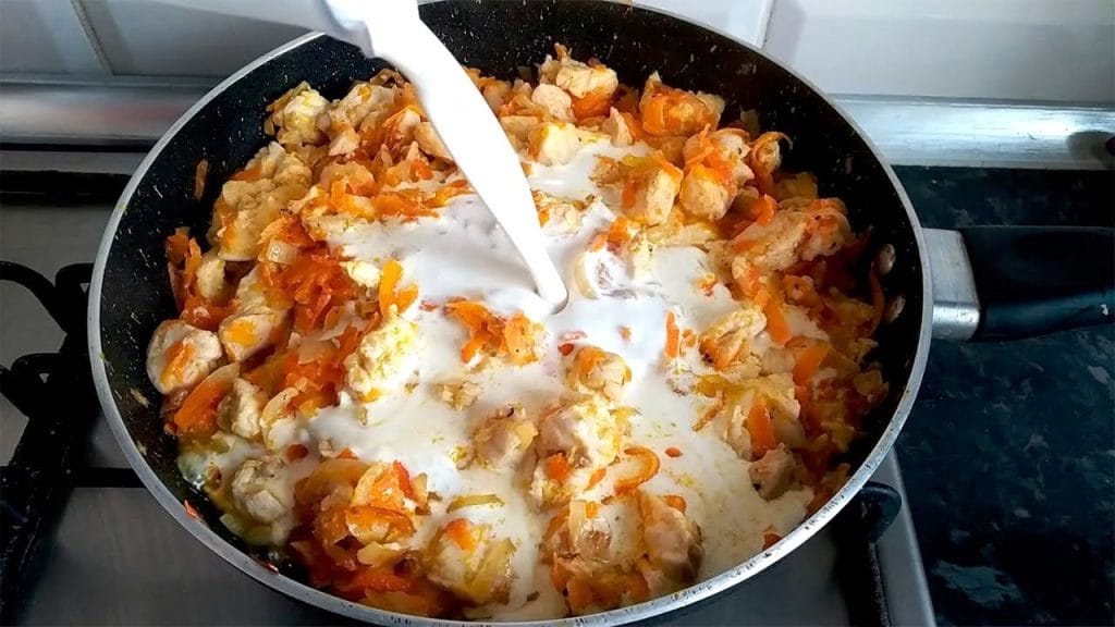 Dėl įvairovės į patiekalą galite įdėti ir grybų – galite naudoti paprastus pievagrybius ar kiaulienos grybus – jie labai mėgsta grietinėlę, o patiekalas pasirodo tiesiog nuostabus ir aromatingas. Jei neturite grietinėlės, puikiai tiks naminė grietinė.