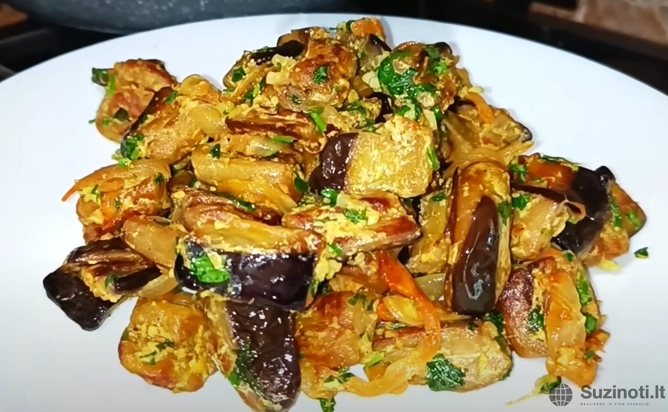 Svogūnus supjaustykite pusžiedžiais ir apkepkite augaliniame aliejuje, įberkite druskos ir cukraus. Nusausinkite baklažanus popieriniu rankšluosčiu, įmuškite plaktą kiaušinį ir palikite dar 10 min.