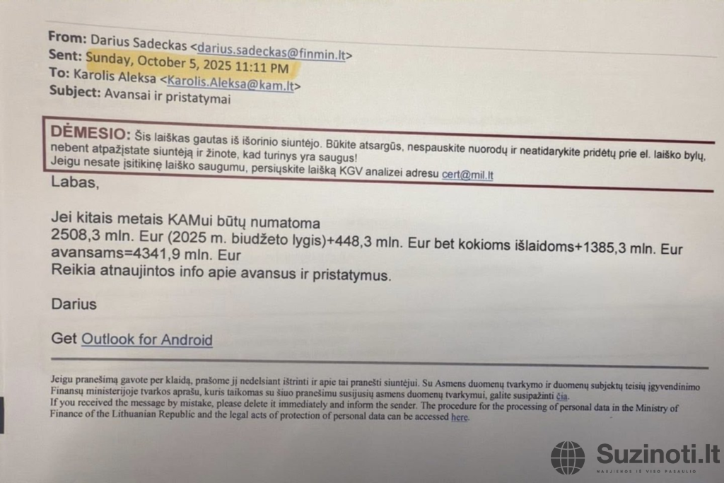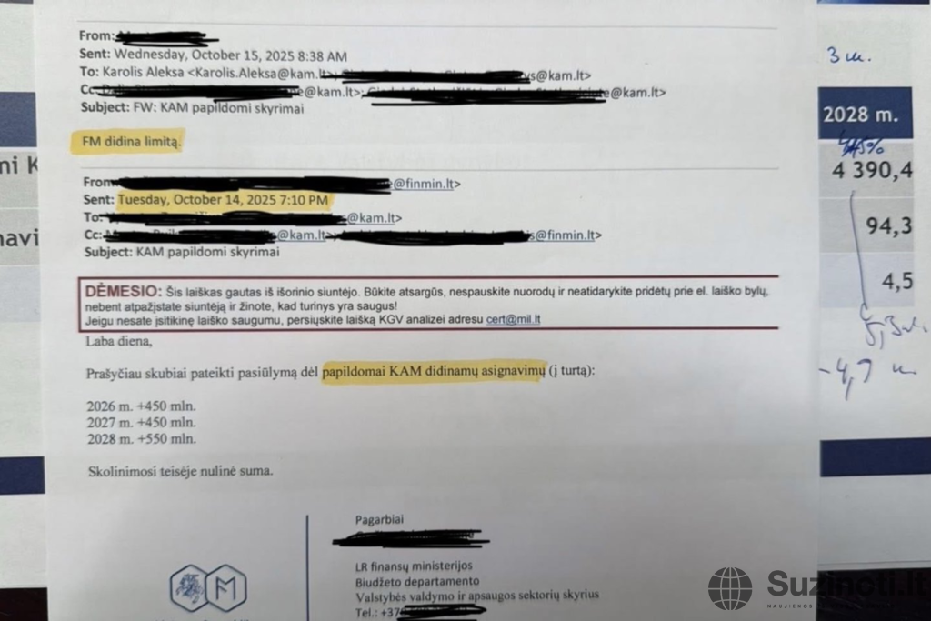 Be to, Šakalienė pateikė elektroninius laiškus, kuriuose užfiksuota, kad spalio 14 dieną, 19 val. vakaro, Finansų ministerija skubiai prašė Krašto apsaugos ministerijos pateikti siūlymus dėl papildomo finansavimo.