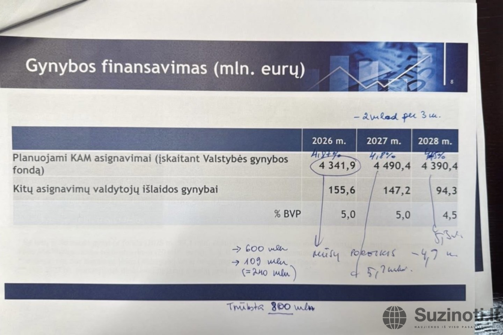 Iš jų matyti, kad liepą buvo svarstoma skirti tik 3,36 proc. BVP (apie 2,9 mlrd. eurų), o spalį jau numatyta 4,87 proc. BVP (4,3 mlrd. eurų). Pridėjus kitų institucijų išlaidas, bendra suma pasiekia 5 proc. BVP.