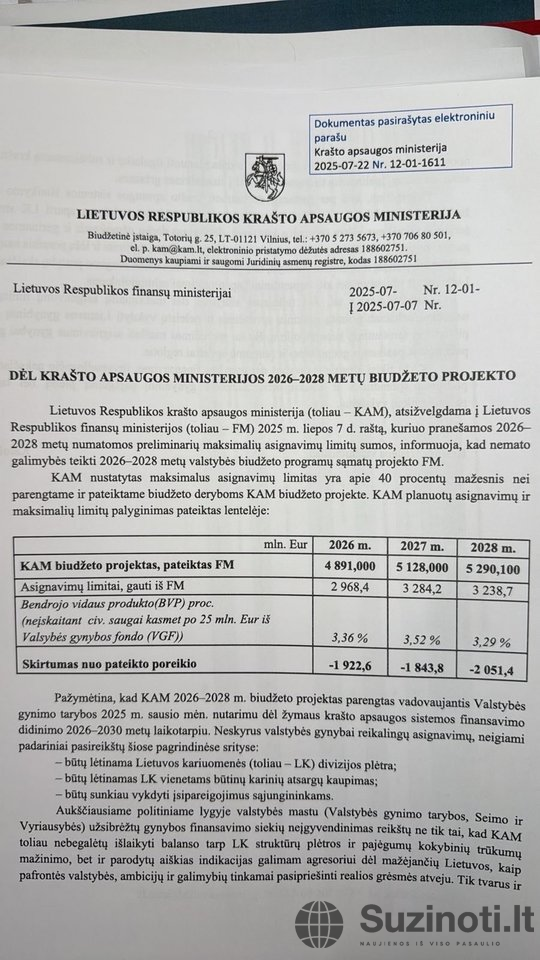 Krašto apsaugos ministrės pareigas paliekanti Dovilė Šakalienė trečiadienį išplatino dokumentus ir elektroninius laiškus, kurie, jos teigimu, įrodo, kad Finansų ministerija vasarą siūlė gynybos biudžetą, nesiekiantį net 4 proc. BVP. Tai, anot politikės, prieštarauja vėliau premjerės Ingos Ruginienės viešai deklaruotai pozicijai apie 5 proc. BVP siekiantį finansavimą.