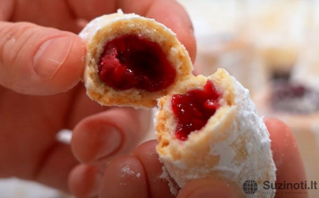 Iškepusius sausainius apvoliokite cukraus pudroje. Gausite skanius sausainius su uogiene viduje.