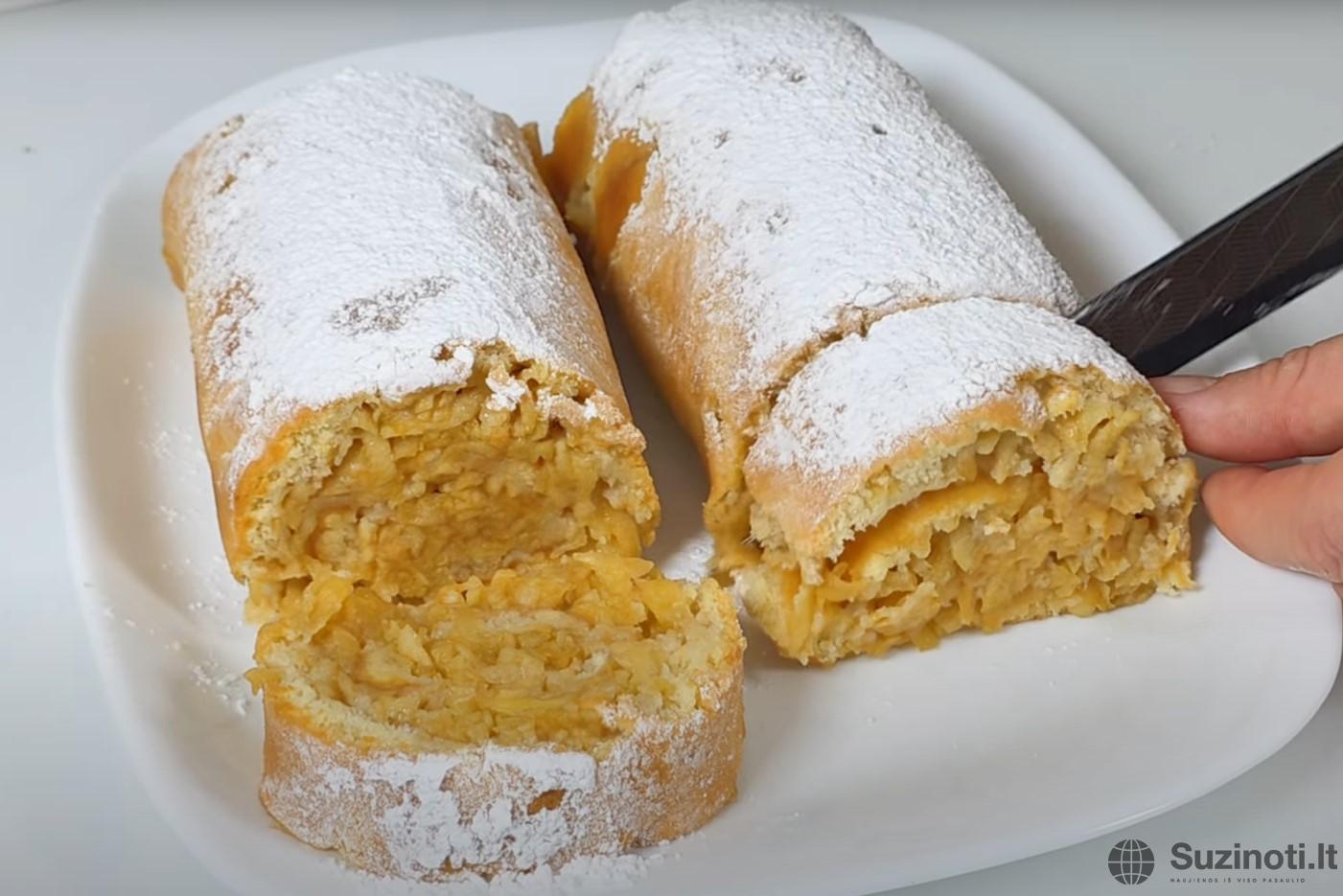 . Iš karto po kepimo suvyniokite pyragą į ritinį su obuolių sluoksniu viduje.