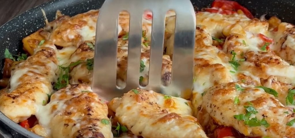 Vidutiniais trintuvės dantukais sutarkuokite mocarelą tiesiai ant vištienos. Tada įkaitinkite orkaitę iki 200 laipsnių, kepkite indą 10 minučių.
