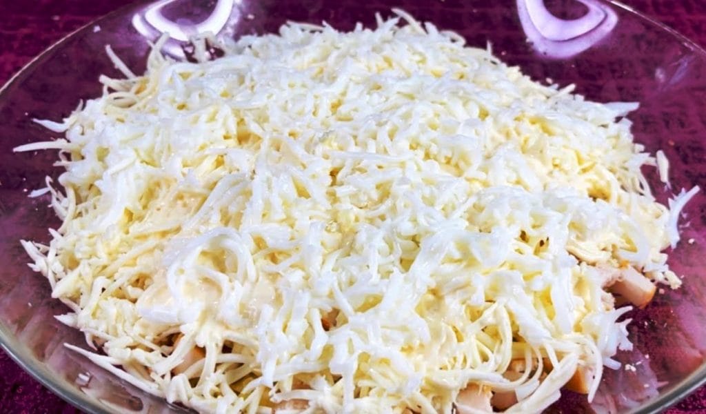 Bulvių mišinį dėkite ant salotų dubens dugno, patepkite majonezu ir pabarstykite druska. Ant bulvių uždėkite vištienos mėsą ir trynį. Ant mišinio užtepkite šiek tiek majonezo ir pabarstykite paviršių sūriu.