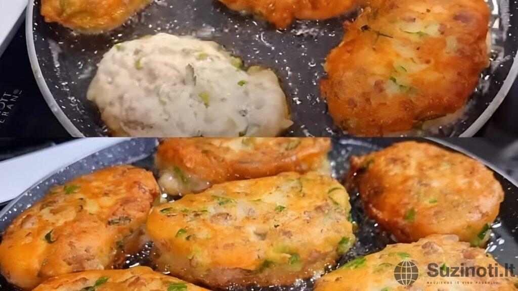 Susmulkinkite žalius svogūnus ir suberkite į maltą mėsą. Sumaišykite ingredientus iš keptuvės su tešla. Šaukštu išgriebkite mišinį ir padėkite ant karštos keptuvės. Kepkite iš kiekvienos pusės iki auksinės rudos spalvos.
