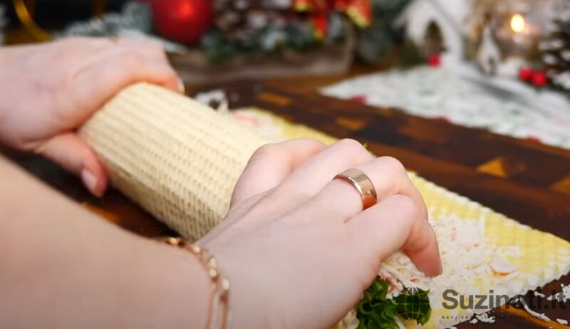 Visą paviršių padenkite majonezo tinkleliu ir susukite vaflį su įdaru į vidų į ritinį.