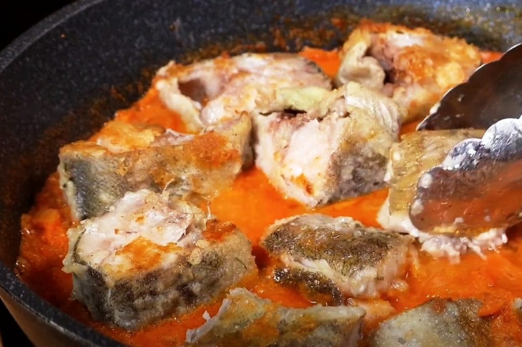 Į keptuvę su padažu supilkite cukrų, suberkite lauro lapą ir užvirinkite. Žuvį sudėkite į padažą ir uždengę ant silpnos ugnies troškinkite 7 minutes.