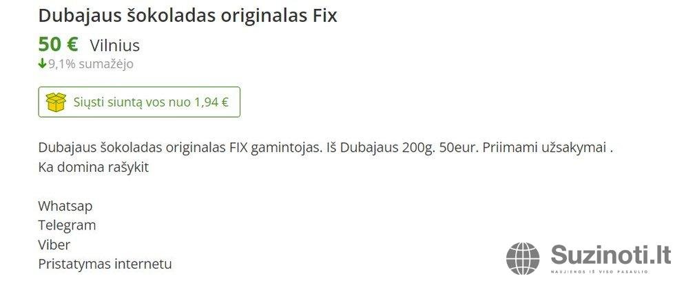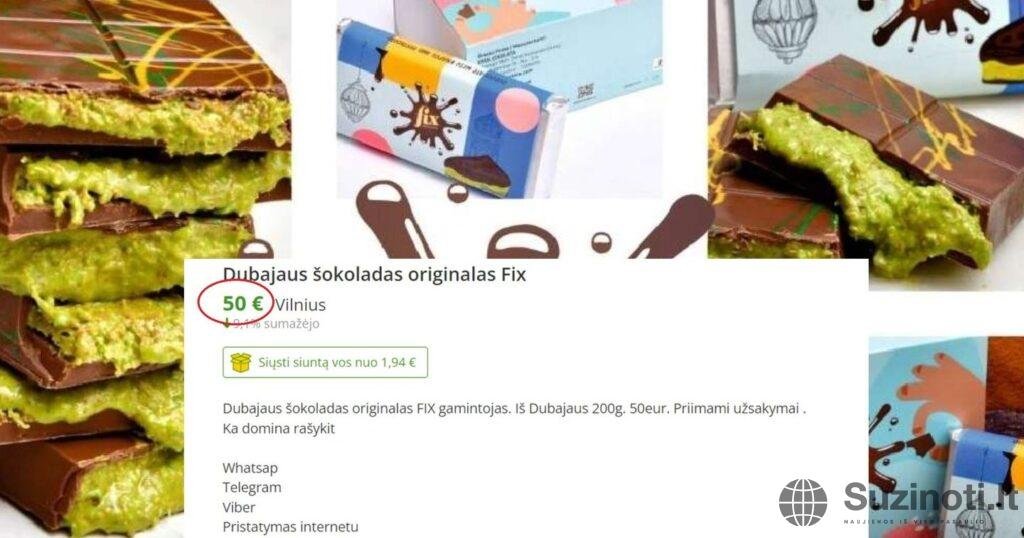 O skelbimų portale Skelbiu.lt vienas pardavėjas tikina, kad prekiauja tikruoju Dubajaus šokoladu, kurį iš ten ir veža. Todėl už 200 g. plytelę prašo net 50 eurų.
