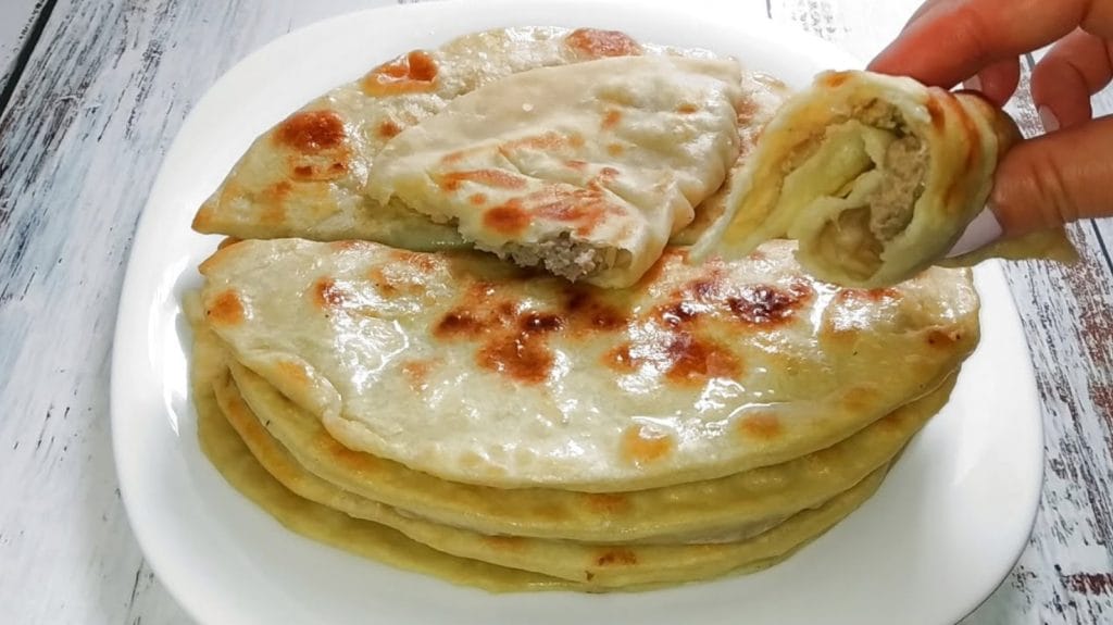 Iškočiokite plonus plokščius paplotėlius, ant vienos dalies dėkite maltą mėsą, tolygiai paskirstykite ir uždenkite antra plokščio pyrago dalimi, kraštelius suspauskite.