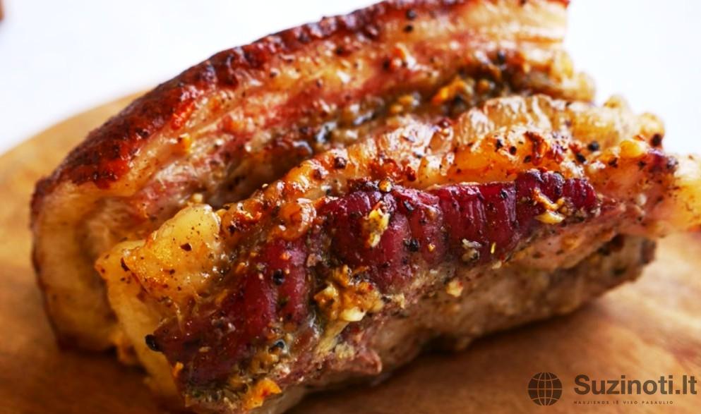 Kiaulienos taukus perduriame peiliu ir supilame marinatą, tada visą gabalėlį iš visų pusių aptepame likusiu marinatu.