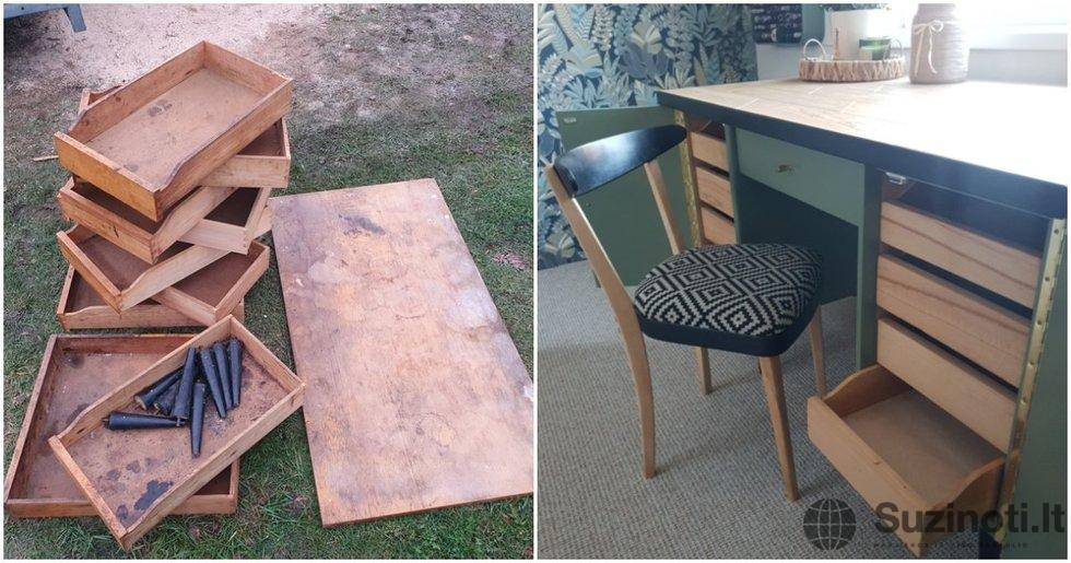 Ada mano, kad pavyko visai neblogai – stalas išliko autentiškas, nors kai kurias detales teko pakeisti. Drėgmė palėpėje sugadino stalčiaus dugnus, todėl Ada juos pakeitė fanera. Stalviršį, kuris taip pat turėjo drėgmės dėmių, ji uždengė parketu, likusiu nuo namo statybos.