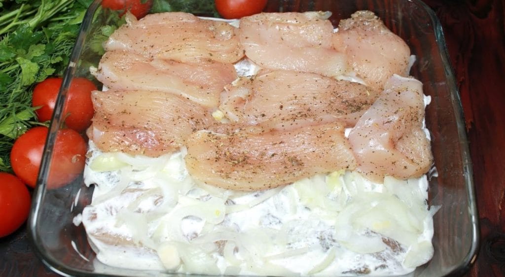 Patarimas : tokiu būdu galite pasigaminti bet kokią mėsą, tik sutrinkite ją stipriau nei vištieną ir marinuokite prieskoniuose ilgiau – 1–1,5 valandos. Taip pat į svogūnų sluoksnius galite įdėti daug smulkintų žolelių.