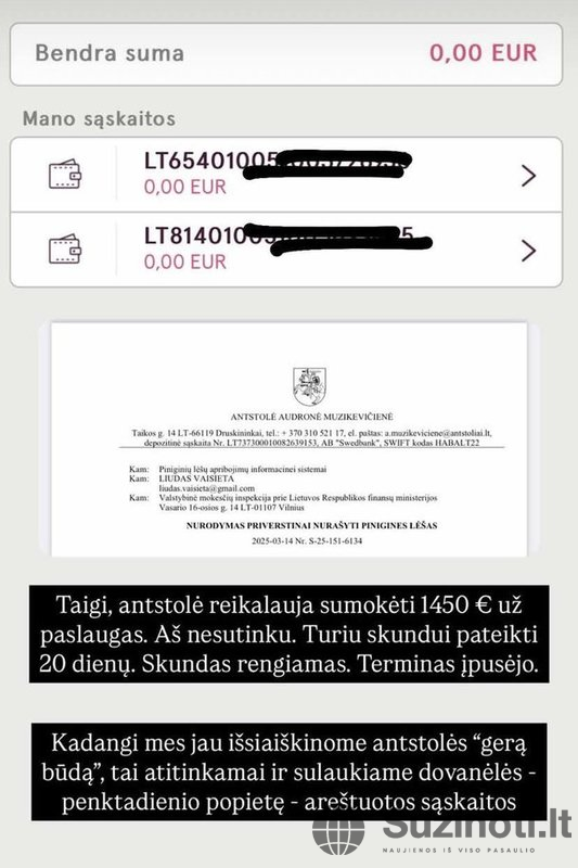Tuomet jis parodė savo banko sąskaitų įrašus, kuriuose matyti, kad anstolei mokėtina suma, 1452,04 eurų, yra rezervuota. Todėl L.Vaisieta nesupranta, kodėl prireikė areštuoti sąskaitas, kuriose buvo pakankamai pinigų nuskaičiuoti minetą sumą.