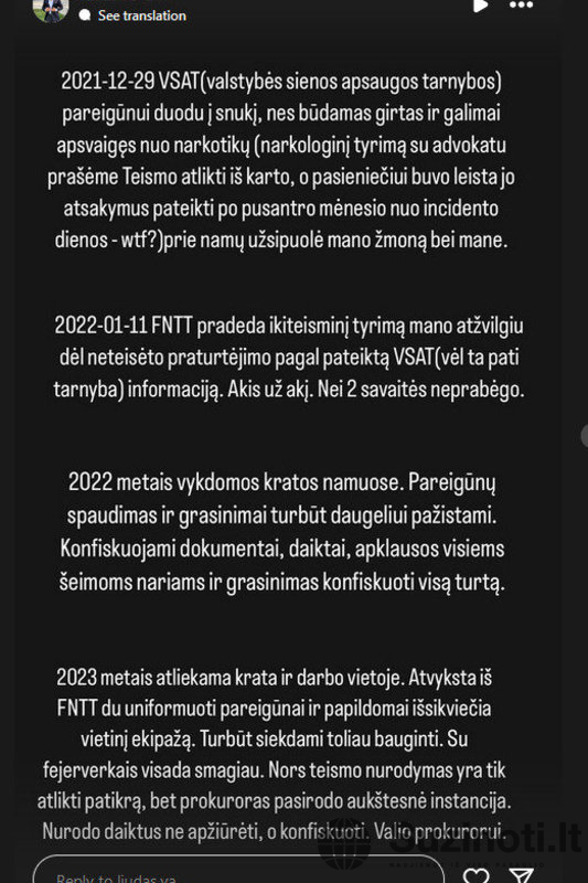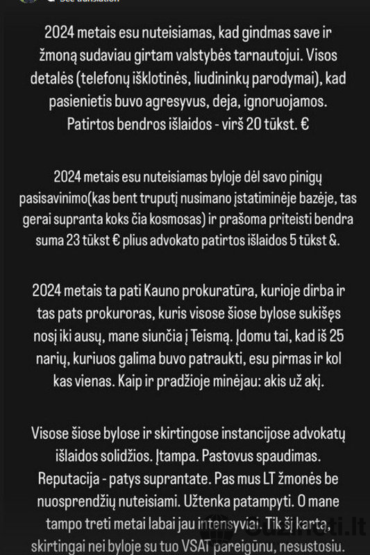 „Visose šiose bylose ir skirtingose instancijose advokatų išlaidos solidžios. Įtampa. Pastovus spaudimas. Reputacija – patys suprantate. Pas mus Lietuvos žmonės be nuosprendžių nuteisiami. Užtenka patampyti. O mane tampo treti metai labai jau intensyviai. Tik šį kartą, skirtingai nei byloje su tuo VSAT pareigūnu, nesustosiu“, – rašė L.Vaisieta.