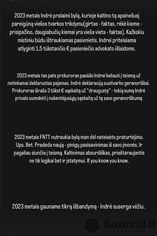 Žmonės.lt primena, kad praėjusių metų rugsėjį verslininką, influencerės Indrės Burlinskaitės vyrą ir buvusį Druskininkų savivaldybės tarybos narį Liudą Vaisietą teismas pripažino kaltu dėl turto pasisavinimo iš jo paties vadovaujamos mažosios bendrijos. Žinomas vyras tuomet tokį sprendimą apskundė, o sausio pabaigoje išgirdo galutinį teismo verdiktą.