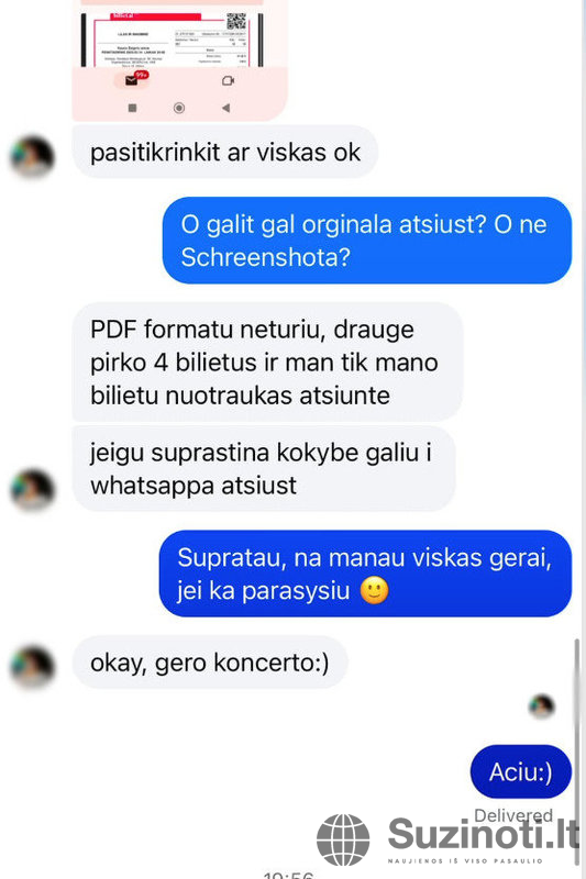 „Vakar (penktadienį, – aut.past.) vyko „Lilo ir Innomine“ sugrįžimo koncertas, mes labai irgi norėjome ten nuvykti, radome internete vaikiną, kuris pardavė mums 2 bilietus po 53 eurus. Nuvykę į „Žalgirio“ areną nepatekome, nes bilietai jau buvo panaudoti. Apgavikas T.L. (vardas ir pavardė redakcijai žinomi, – aut.past.) pasielgė taip iš savo asmeninės paskyros, pinigai pervesti į asmeninę sąskaitą. „Facebook“ susirinko daug žmonių, kurie taip pat buvo jo apgauti. Grupėje „Nukentėję nuo T.L., „Lilas ir Innomine“ jau yra 63 žmonės, nežinom, ar visi nukentėjo, ar yra ir stebėtojų.