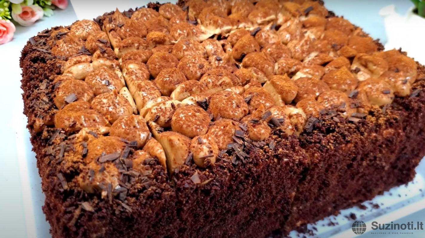 Patarimas : gatavą ir atvėsusį pyragą galite tiesiog apibarstyti cukraus pudra arba apibarstyti šokoladiniu glajumi, sumaišydami su smulkintais riešutais ir citrusinių vaisių žievele.