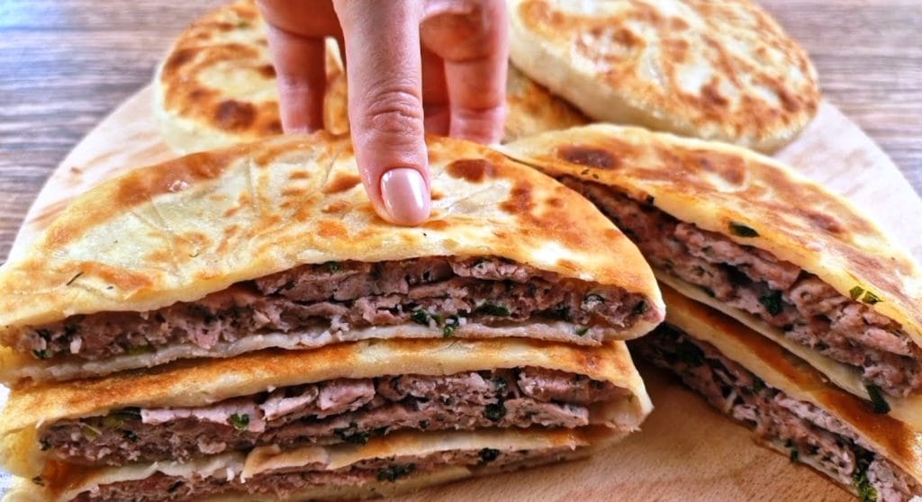 Padalinkite tešlą į 6 lygias dalis ir suformuokite nedidelius rutuliukus. Kolobokus iškočiokite plonais sluoksniais, kur dedame įdarą. Surenkame tešlą į maišelį, viduje sandariai uždarome maltą mėsą.