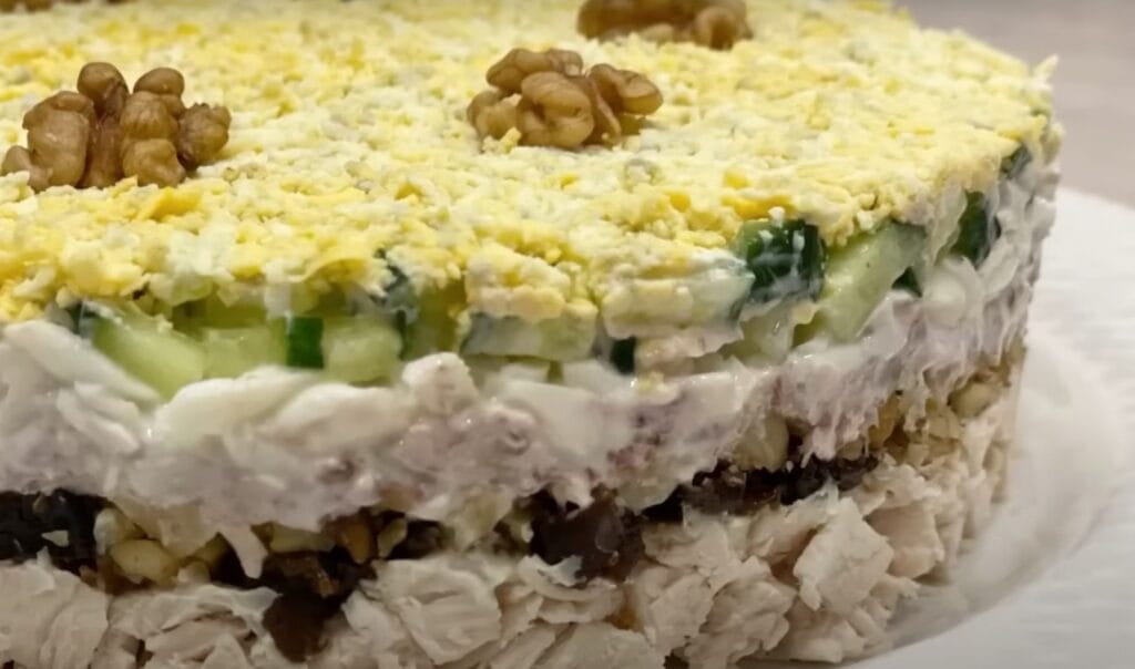 Vištienos filė išvirkite, kol suminkštės, supjaustykite mažais kubeliais. Agurką ir džiovintas slyvas taip pat supjaustome mažais kubeliais, o graikinius riešutus susmulkiname ne per smulkiai.