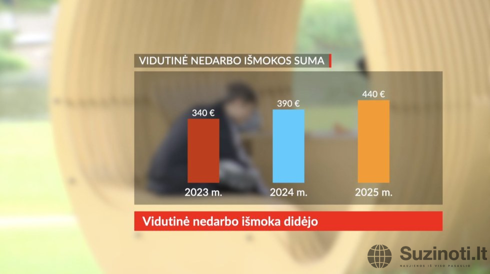 Augo ir vidutinė nedarbo išmoka, kuri šiemet palyginus su 2023-aisiais beveik 100 eurų didesnė.