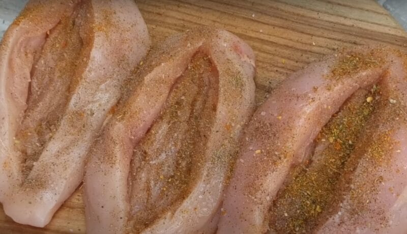 Peiliu giliai įpjaukite kiekvieną vištienos krūtinėlę ir viduje padarykite skylutę. Pasūdykite ir pabarstykite krūtinėlės mėsos prieskoniais.