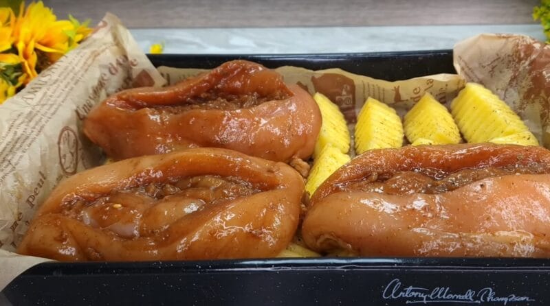 Į kepimo indą įdėkite pergamentinį popierių, ant pergamento sudėkite bulves ir pabarstykite druska bei juodaisiais pipirais. Ant bulvių uždėkite marinuotų vištienos krūtinėlių.