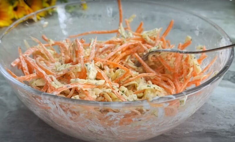 Morkas nulupkite ir sutarkuokite korėjietiškai. Sūrį sutarkuokite stambia tarka ir sumaišykite su morkomis. Morkas ir sūrį sumaišykite su sausomis petražolėmis ir majonezu.