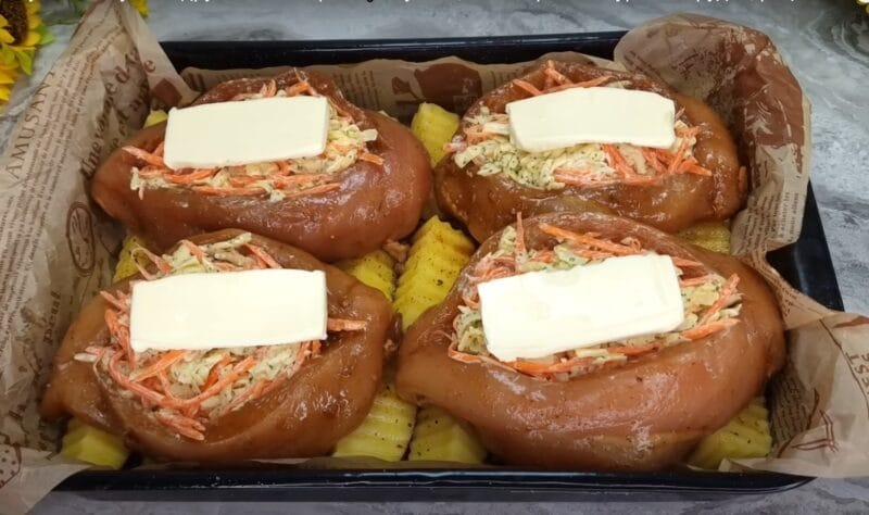 Supilkite mišinį į kiekvieną vištienos krūtinėlę. Sviestą supjaustykite plonais griežinėliais ir dėkite ant įdarytų krūtinėlių.