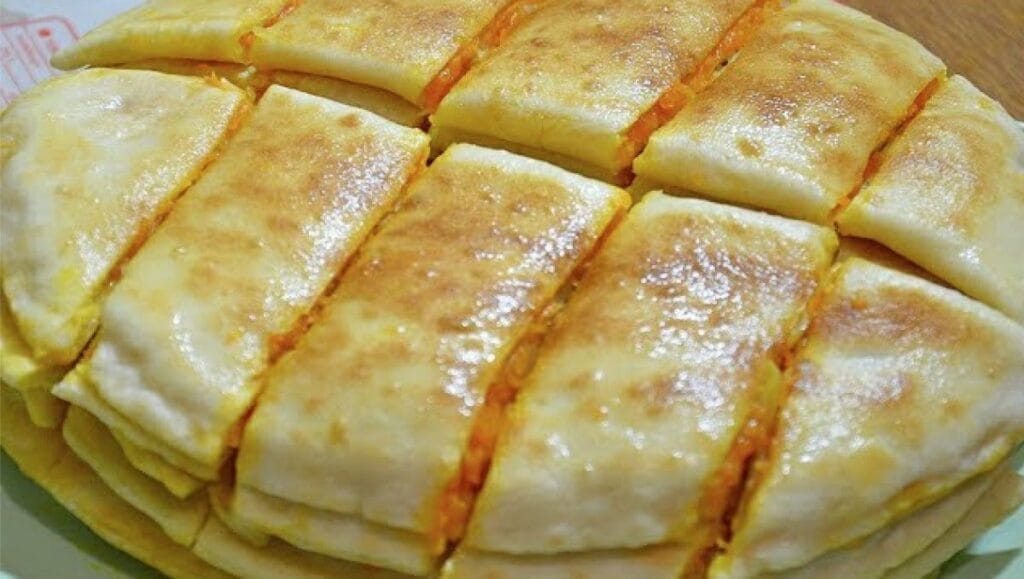 Padalinkite tešlą į lygias dalis, maždaug 14-15 dalių. Kiekvieną paplotį plonai iškočiokite ir dėkite įdarą.