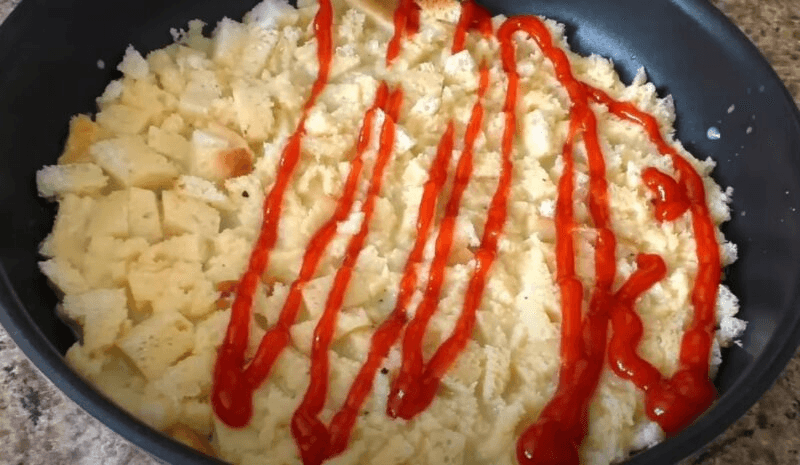 Duoną supjaustykite mažais kubeliais. Keptuvę ištepkite augaliniu aliejumi ir ant dugno padėkite dalį duonos. Duonos sluoksnį užtepkite ½ kiaušinių mišinio.