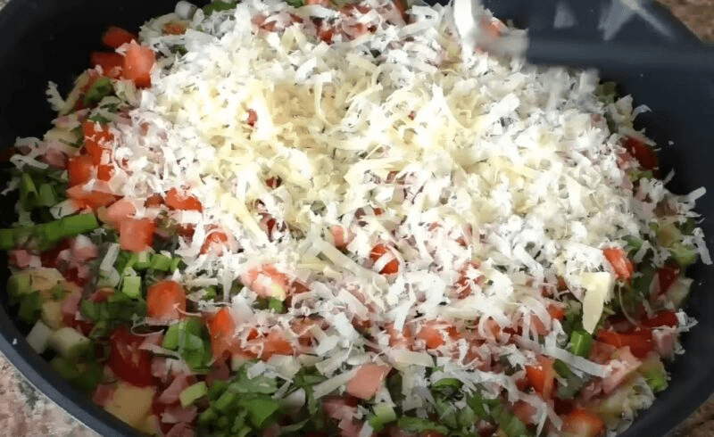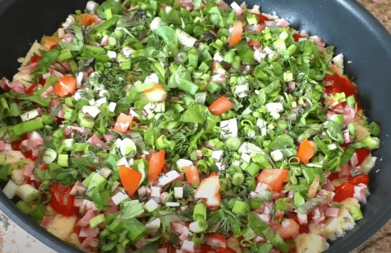 Dešrą ir pomidorą supjaustykite mažais kubeliais. Sūrį sutarkuokite stambia tarka, susmulkinkite žalius svogūnus, bazilikus ir kitas prieskonines žoleles pagal skonį.