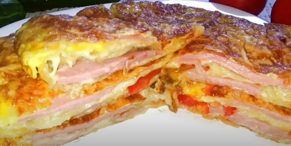 Greiti pusryčiai iš pita duonos, kumpio arba dešros, sūrio ir pomidorų.